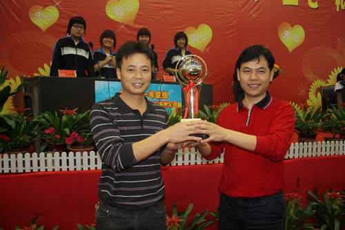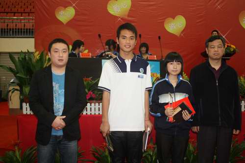 高一年級主任陳非凡(左一)從蔡校長手中接過獎杯
