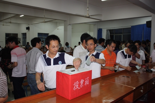 6月23日晚,圖書(shu) 館會(hui) 議室燈火通明,2010級年級主任競聘演講火熱進行中。學校2010屆高三任課教師、全體(ti) 教工代表參與(yu) 投票。投票結果統計,陳建輝老師以票數第一當選為(wei) 2010級年級主任。
