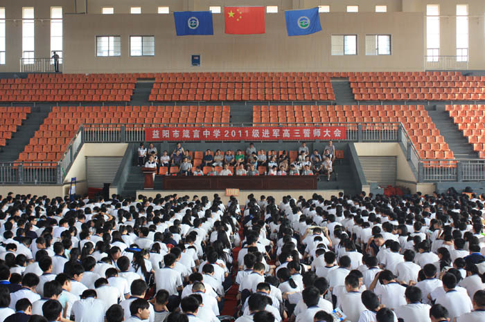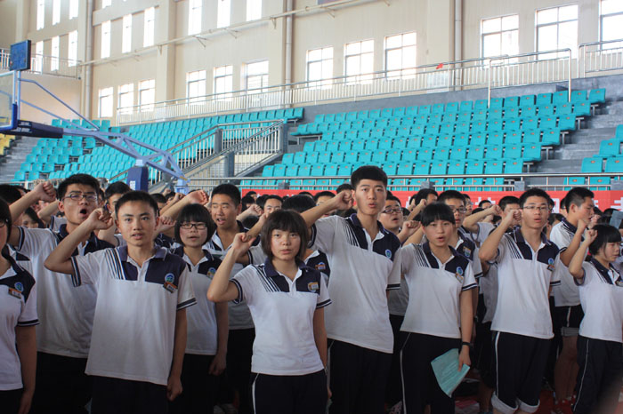 “我將以最飽滿的精神迎接高三,麵對挑戰,毫不畏懼……”6月15日上午,我校體(ti) 育館內(nei) 響起高亢嘹亮的誓言,在2013年高考剛剛過去一周之際,學校組織全體(ti) 高二學生在體(ti) 育館隆重舉(ju) 行進軍(jun) 高三誓師大會(hui) 。