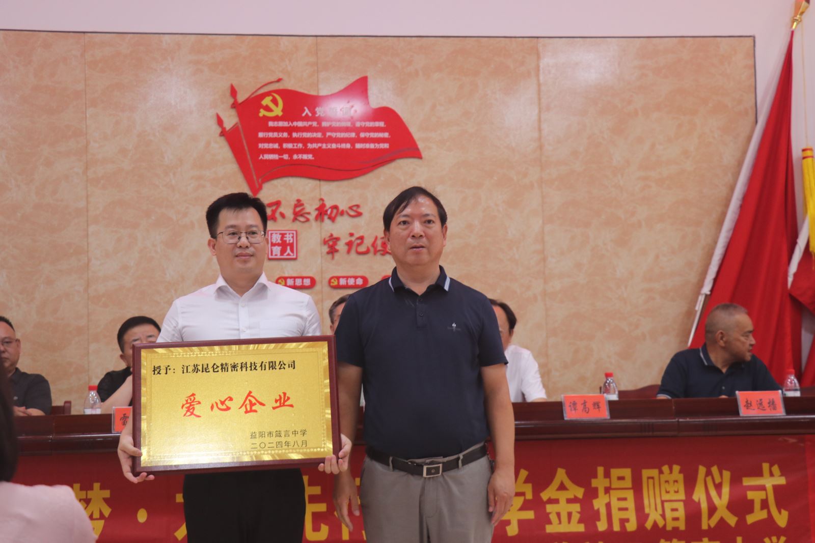 學校黨(dang) 委書(shu) 記、校長孟德良對慷慨解囊、捐資助學的江蘇昆侖(lun) 精密科技有限公司、湖南弘輝科技有限公司、益陽市箴言書(shu) 院文化交流會(hui) 表示最熱烈的歡迎和最誠摯的感謝!希望獲獎學子勤奮學習(xi) 、積極進取,成為(wei) 強國的棟梁之材,並時刻學會(hui) 感恩、學會(hui) 回報、學會(hui) 傳(chuan) 遞愛心。